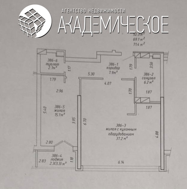В квартире площадью 71,4 м2 расположены комната 15,1 м2, просторная кухня-гостиная 37,2 м2, два санузла 2,7 м2 и 6,2 м2 . Панорамные окна выходят на южную сторону и делают квартиру светлой и уютной.