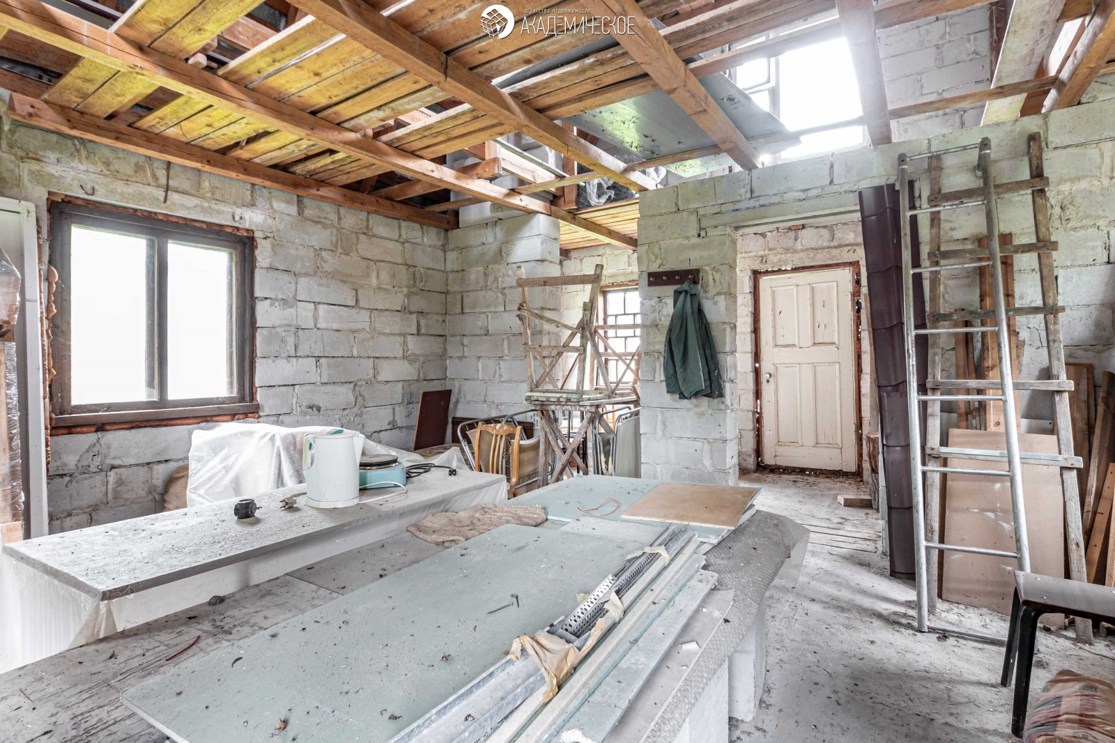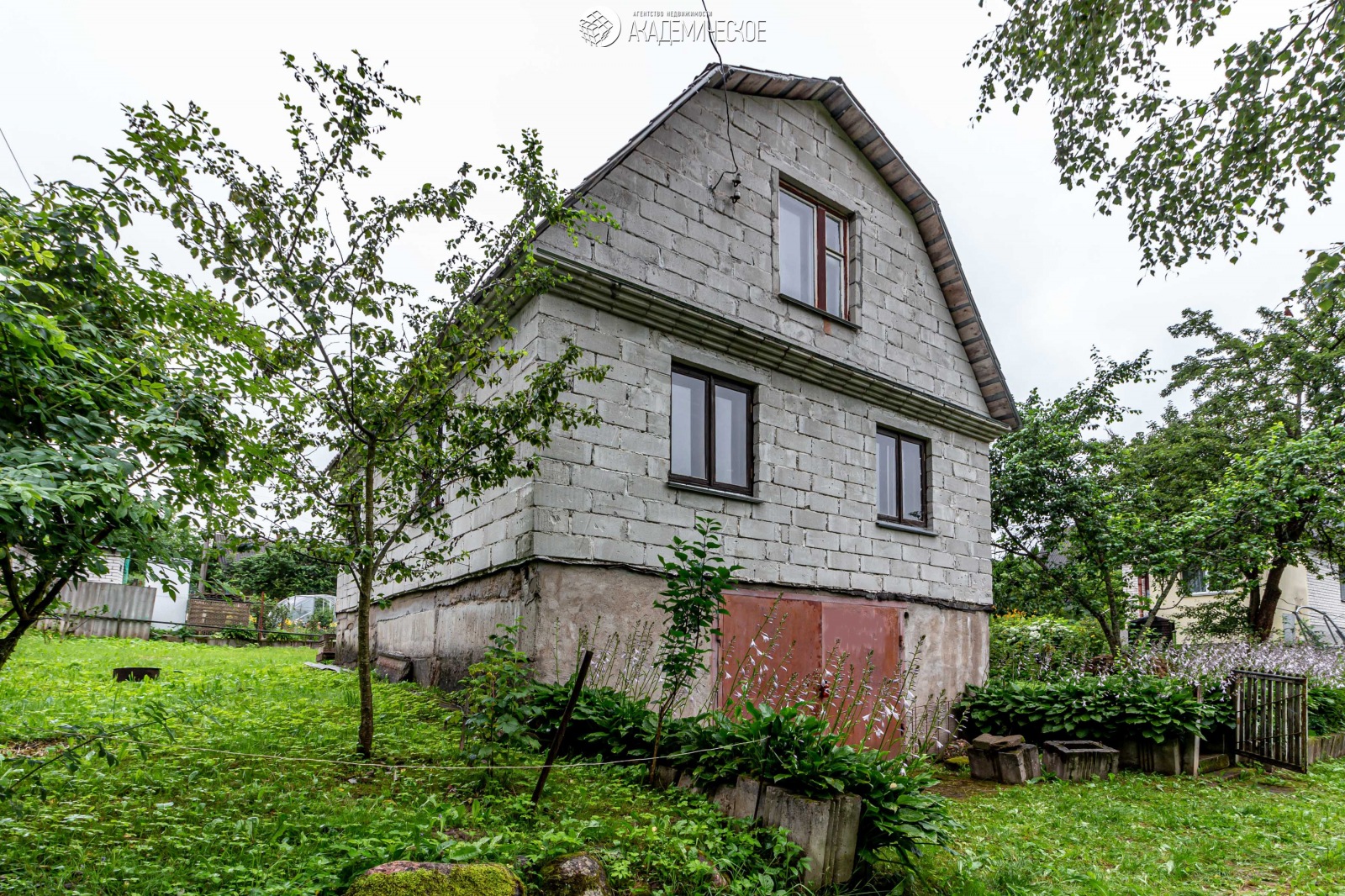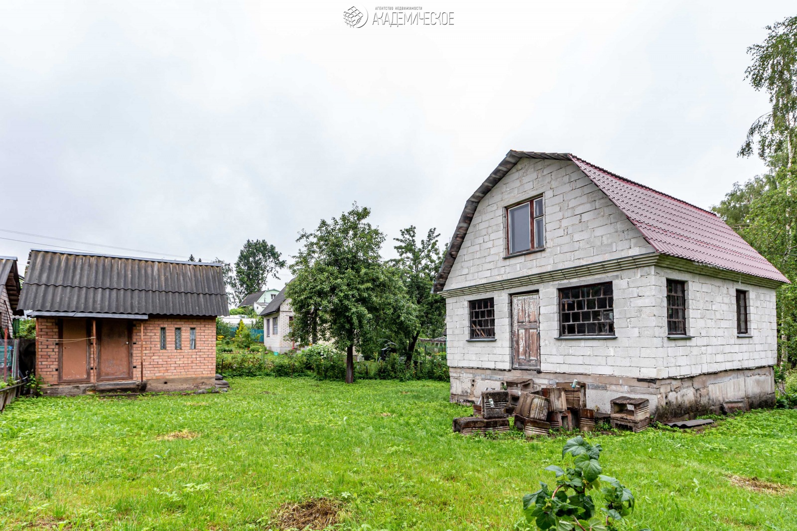 Двухэтажный блочный дом, железобетонные перекрытия, крыша металлочерепица, двери и окна деревянные (сосна). В цоколе гараж + новые стройматериалы: комплект железобетонных изделий для входной группы (направляющие, ступеньки), бетонные столбы для забора и сетка рабица. Электричество, вода сезонная. Кирпичная летняя кухня, в ней оборудовано место для размещения душа, сухой погреб для хранения. Уборная.
