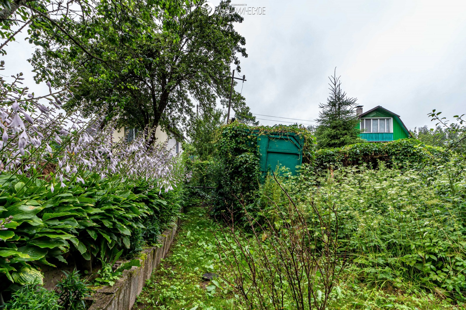 Земельный участок 0,0448 га в частной собственности: ухожен. Плодовые деревья (груша, слива), кустарники (голубика, малина, смородина), цветы.