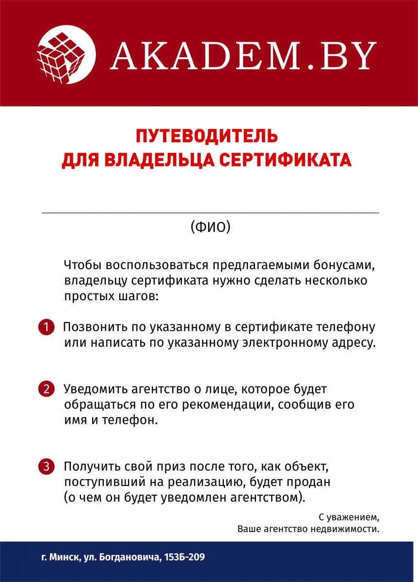 И, если кто-то из ваших знакомых будет нуждаться в помощи риэлтерской организации - по продаже любого типа недвижимости - всё, что стоит сделать Владельцу бонус-Сертификата, это дать близкому человеку добрый совет обратиться в "Академическое" и подтвердить, что от него придет человек заключать договор на продажу своей недвижимости.
