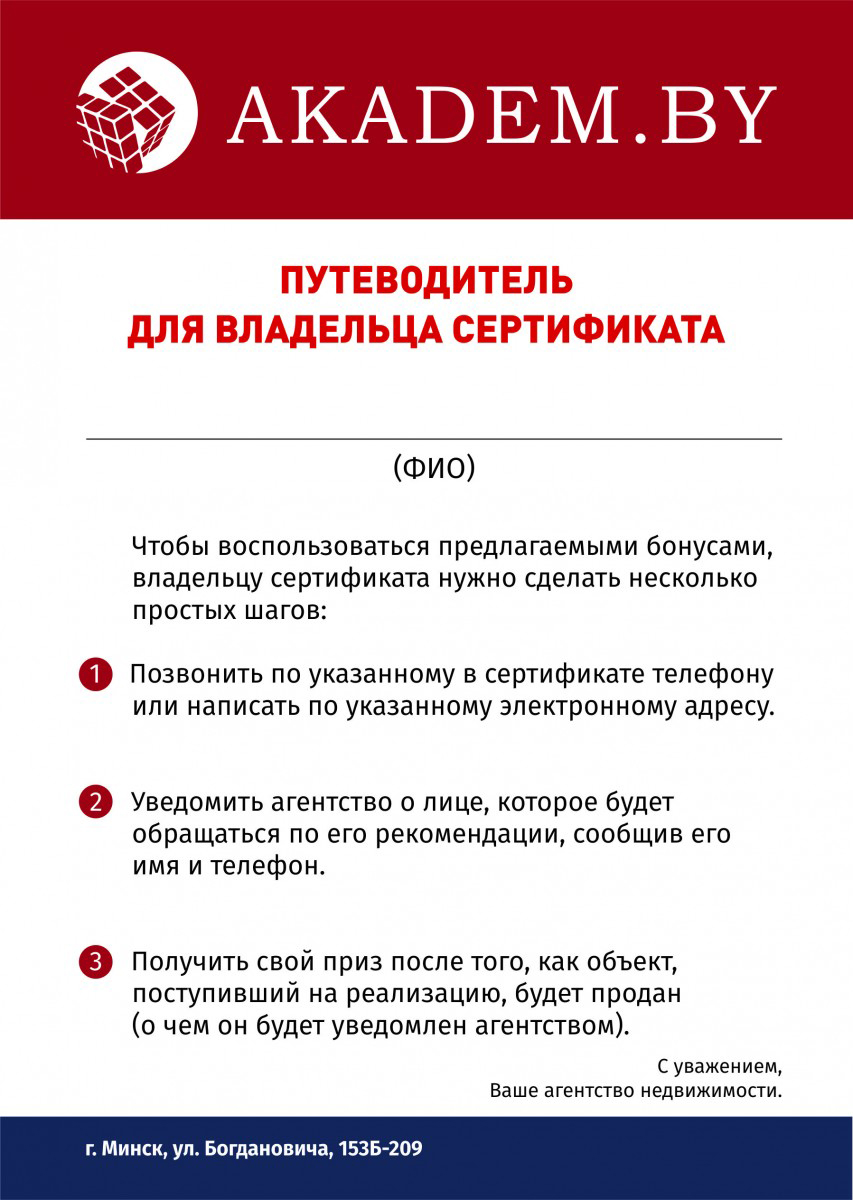 И, если кто-то из ваших знакомых будет нуждаться в помощи риэлтерской организации - по продаже любого типа недвижимости - всё, что стоит сделать Владельцу Сертификата, это дать близкому человеку добрый совет обратиться в "Академическое", подтвердить, что от него придет человек заключать договор на продажу своей недвижимости. И на этом всё - информация будет зафиксирована, и владельцу Сертификата останется только немного подождать и забрать причитающееся.